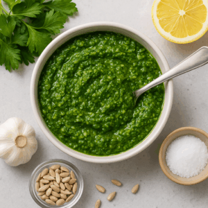 Persiljepesto – enkelt grundrecept baserat på 100 g persilja. Perfekt för att smaksätta pasta, potatis, sallad eller som såsbas. Lätt att dubbla eller halvera.